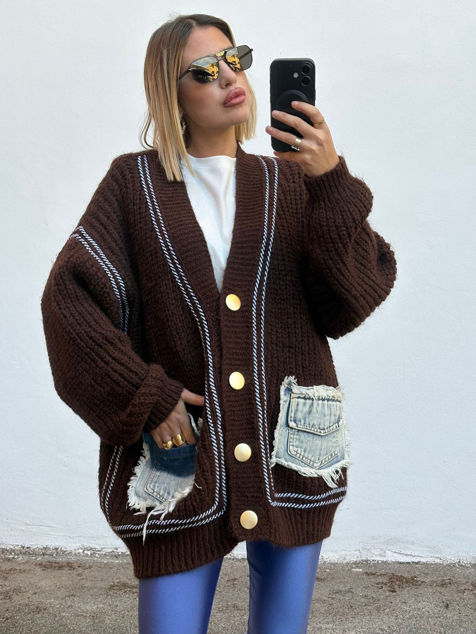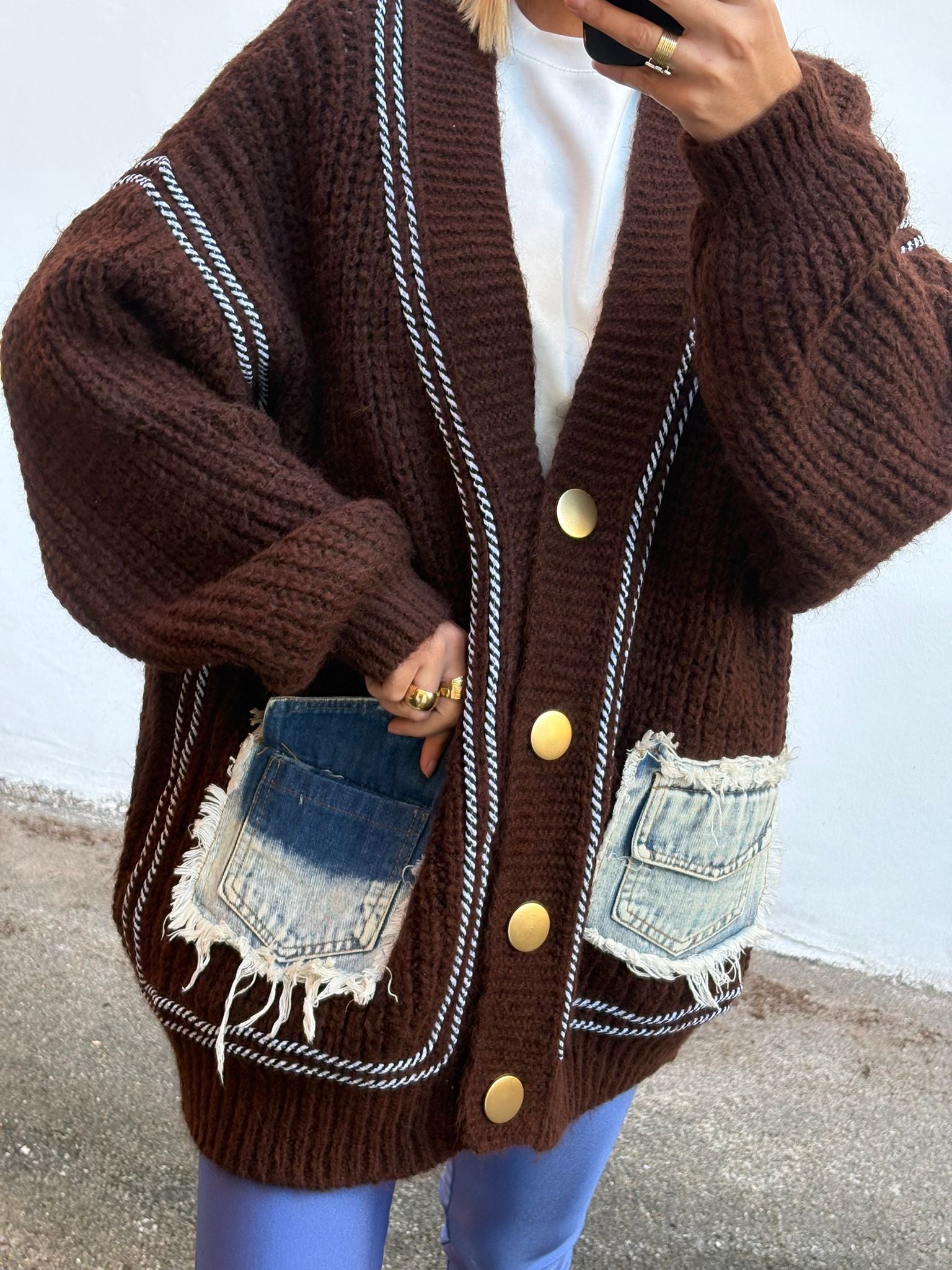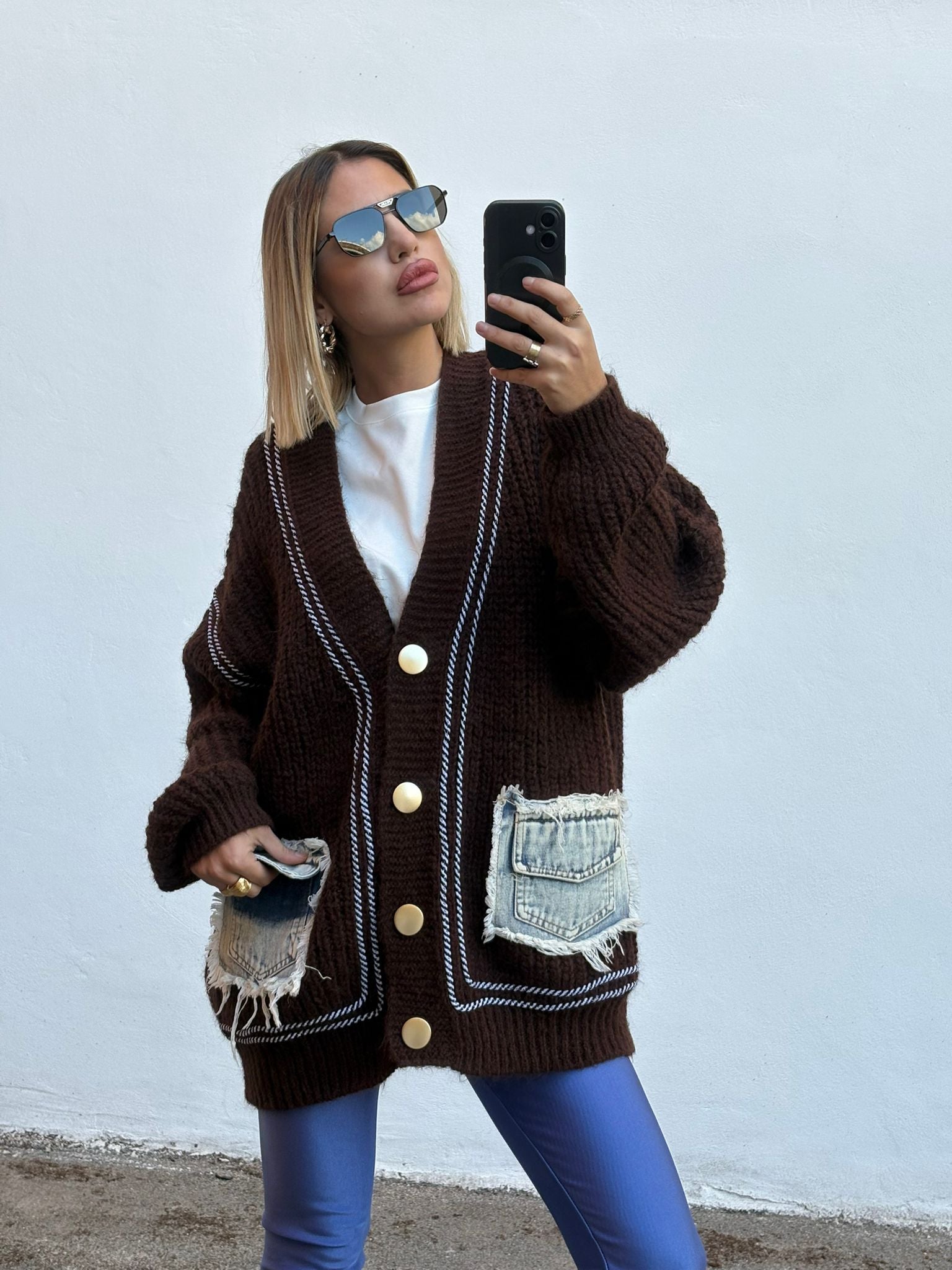Cardigan in lana con tasche in jeans, perfetto per un look casual e comodo. Realizzato con materiali di alta qualità, garantisce un'ottima vestibilità e un tocco di stile in più al tuo outfit. Ideale per ogni occasione, da indossare sia di giorno che di sera.