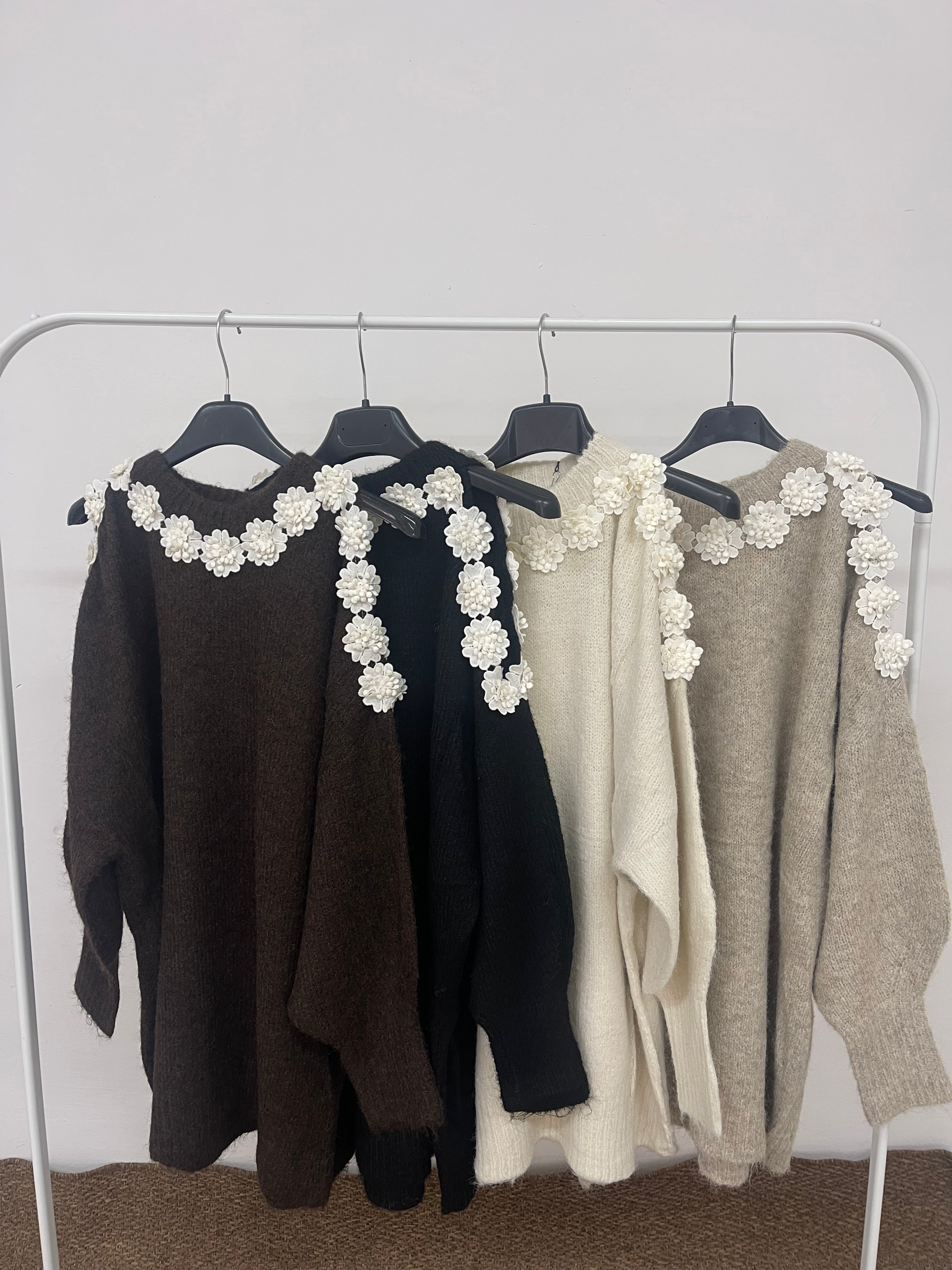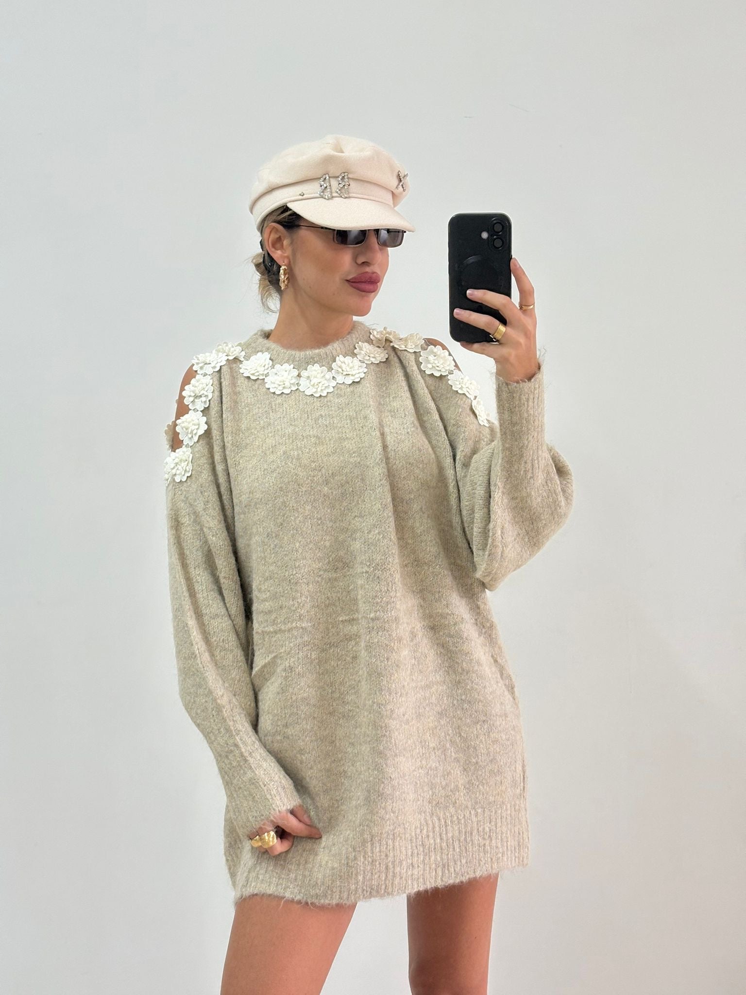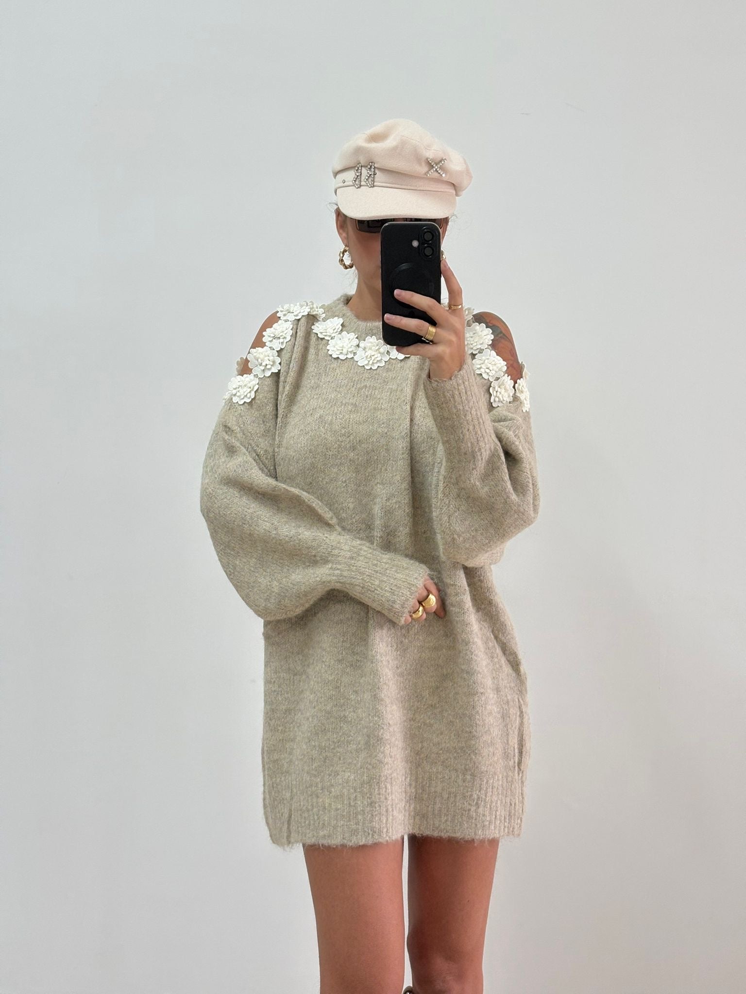 Questa maglia Melody è un maglione lungo over decorato con eleganti inserti floreali sulle spalle. Ideale per un look casual e femminile, il suo design unico e moderno ti farà risaltare in ogni occasione. Realizzato con materiali di qualità, garantisce comfort e stile senza compromessi.
